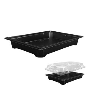 С точки зрения бизнеса, черное дно контейнера помогает выделиться среди стандартных вариантов, повышая премиальное восприятие вашей кухни. Оно практично: меньше заметны пятна и разводы, что сохраняет презентабельный вид даже при доставке на большие расстояния. Контейнер легко штабелируется и транспортируется, а прочный материал гарантирует сохранность суши до момента подачи