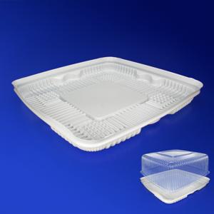 Пластиковая упаковка для тортов достаточно крепка, весит меньше картонной. Она обладает лучшей влаго- и жиронепроницаемостью и гигиеничностью, что позволяет хранить кондитерское изделие дольше. Малый вес облегчает доставку упаковки производителю тортов. Дно из полистирола имеет толщину 400-700 микрон. При этом его механические свойства обеспечиваются формой, имеющей ребра жесткости, которые, в свою очередь, делают тортницу красивее. Также дно может быть дополнено шипами, равномерно распределенными по площади дна упаковки для тортов, чтобы добавить устойчивости торта и не допустить его сползания от центра к краям при наклонах. При хранении и транспортировке допускается штабелирование до 3шт.