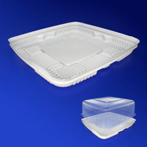Пластиковая упаковка для тортов достаточно крепка, весит меньше картонной. Она обладает лучшей влаго- и жиронепроницаемостью и гигиеничностью, что позволяет хранить кондитерское изделие дольше. Малый вес облегчает доставку упаковки производителю тортов. Дно из полистирола имеет толщину 400-700 микрон. При этом его механические свойства обеспечиваются формой, имеющей ребра жесткости, которые, в свою очередь, делают тортницу красивее. Также дно может быть дополнено шипами, равномерно распределенными по площади дна упаковки для тортов, чтобы добавить устойчивости торта и не допустить его сползания от центра к краям при наклонах. При хранении и транспортировке допускается штабелирование до 3шт.