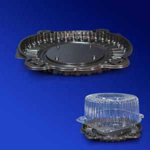 Пластиковая упаковка для тортов достаточно крепка, весит меньше картонной. Она обладает лучшей влаго- и жиронепроницаемостью и гигиеничностью, что позволяет хранить кондитерское изделие дольше. Малый вес облегчает доставку упаковки производителю тортов. Дно из полистирола имеет толщину 400-700 микрон. При этом его механические свойства обеспечиваются формой, имеющей ребра жесткости, которые, в свою очередь, делают тортницу красивее. Также дно может быть дополнено шипами, равномерно распределенными по площади дна упаковки для тортов, чтобы добавить устойчивости торта и не допустить его сползания от центра к краям при наклонах. При хранении и транспортировке допускается штабелирование до 3шт.