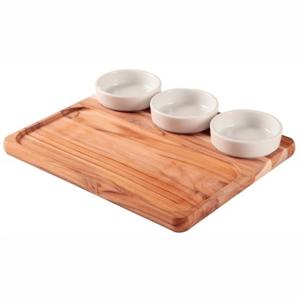 Изготовленная из прочного тикового дерева, доска отличается долговечностью и стильным внешним видом. В комплект входят три фарфоровых соусника диаметром 85 мм и высотой 28 мм, которые идеально подходят для подачи соусов, паст и закусок.