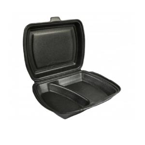 Черный одноразовый ланч-бокс из вспененного полистирола (ВПС) с двумя секциями — практичное решение для упаковки, хранения и транспортировки готовой еды. Две секции позволяют аккуратно разделять основные блюда и гарниры, предотвращая смешивание и сохраняя эстетичный вид при доставке и продаже навынос
