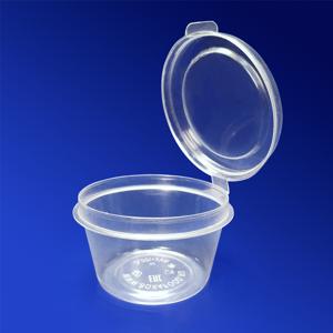Одноразовый пластиковый круглый соусник с откидной крышкой изготовлен из прозрачного полипропилена.