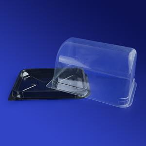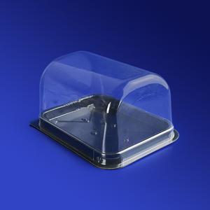Пластиковая упаковка для пирожных достаточно крепка, весит меньше картонной. Она обладает лучшей влаго- и жиронепроницаемостью и гигиеничностью, что позволяет хранить кондитерское изделие дольше. Малый вес облегчает доставку упаковки производителю пирожных. Упаковка из полиэтилентерефталата имеет толщину 400-700 микрон. При этом ее механические свойства обеспечиваются куполообразной формой, не имеющей ребер жесткости, улучшая обзор пирожного внутри упаковки.